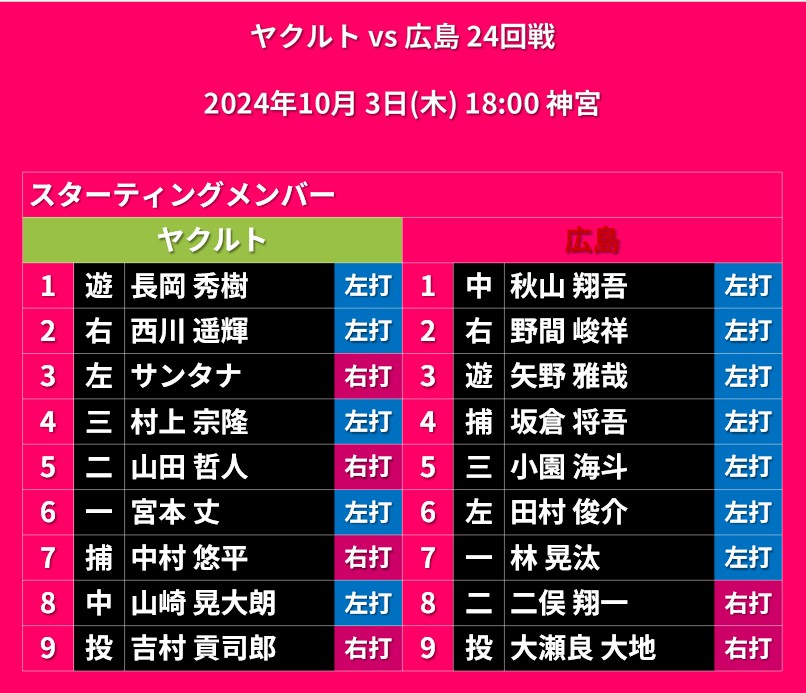 【スタメン】2024年10月3日(木)◆vs ヤクルト 24回戦 (神宮)