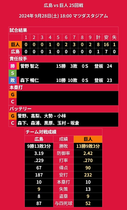 【試合結果】2024年9月28日(土)◆vs 巨人 25回戦 (マツダスタジアム)