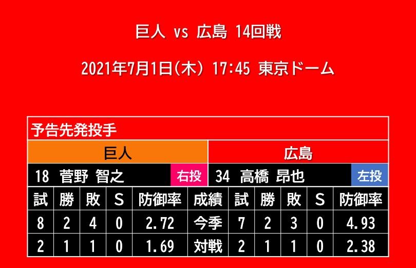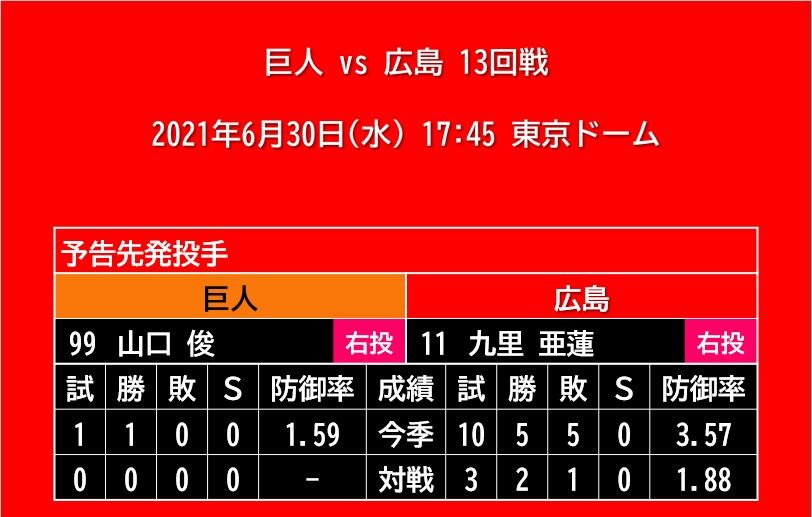 【スタメン】2021年6月30日(水)◆vs 巨人 13回戦 (東京ドーム)