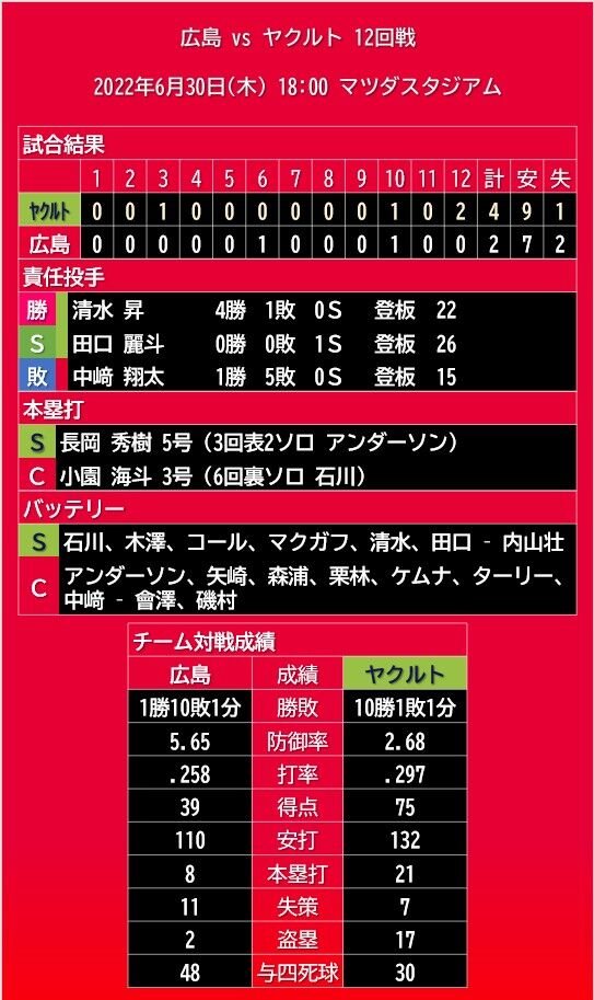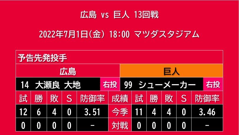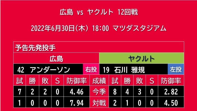 【予告先発】2022年6月30日(木)◆vs ヤクルト 12回戦 (マツダスタジアム) 2022年06月29日 カテゴリ:広島東洋カープ◆予告先発 mixiチェック タグ :#予告先発#ガツガツGUTS!