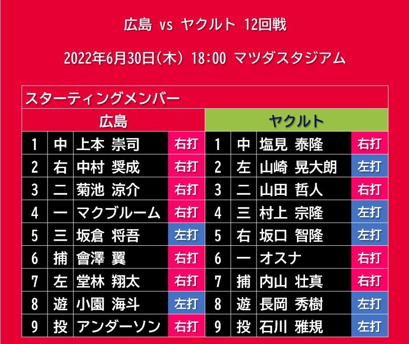 【スタメン】2022年6月30日(木)◆vs ヤクルト 12回戦 (マツダスタジアム) 2022年06月30日 カテゴリ:広島東洋カープ◆スタメン mixiチェック タグ :#スタメン#ガツガツGUTS!