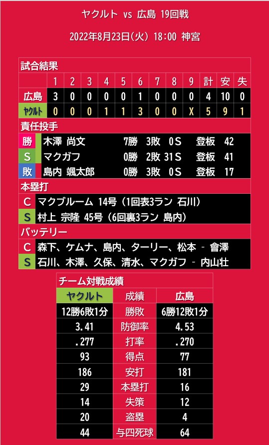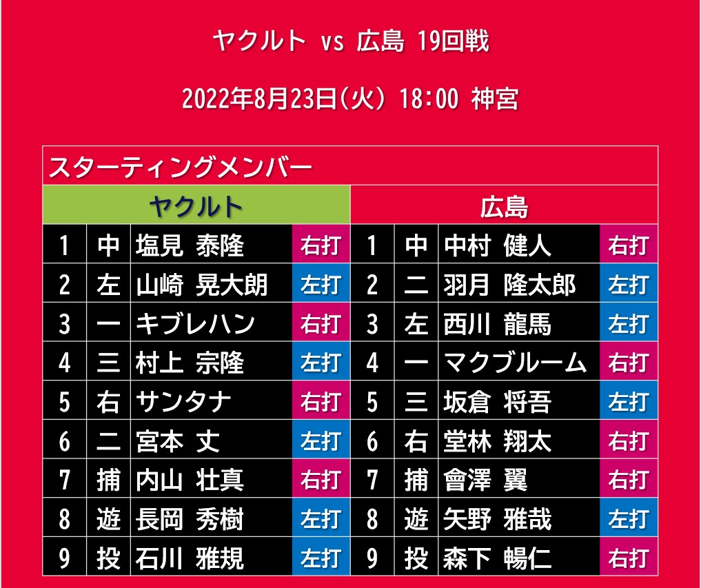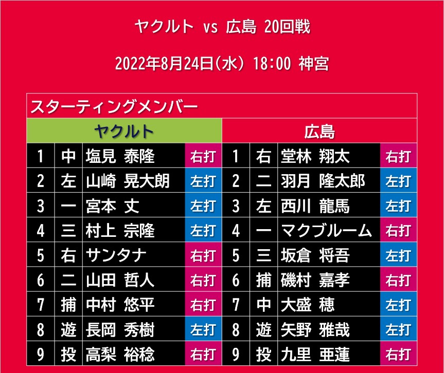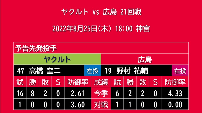 【予告先発】2022年8月25日(木)◆vs ヤクルト 21回戦 (神宮)
