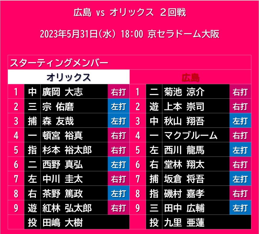 【試合結果】2023年5月31日(水)◆vs オリックス 2回戦 (京セラドーム大阪) 2023年05月31日 カテゴリ:広島東洋カープ◆試合結果 mixiチェック こいほ~!やっと勝ちましたか。さすが翔吾ですね。素晴らしい。一発で確実に仕留めるからなぁ。ここのところ、チャンスで???が続いてましたけどね。ここぞという時は、やはりさすが。亜蓮はここまで安定した投球が続くと、さらに一皮むけたと認めざるを得ませんね。安定感抜群。何か掴んだ感じかな?次回もお願いします。これで連敗呪縛から逃れて、明日はのびのびガンガン行ってほしいですね。コルニエルは、次はビシッと締めていかないとね。マク様当たり出てこないかなぁ。 タグ :#試合結果
