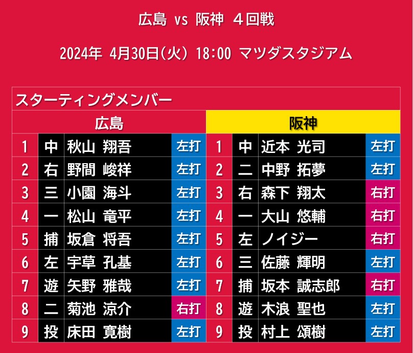 【試合結果】2024年4月30日(火)◆vs 阪神 4回戦 (マツダスタジアム) 2024年04月30日 カテゴリ:広島東洋カープ◆試合結果 mixiチェック 床ちゃんがこれだけ四死球連発すればね。初球隅イチか。左並べれば効果的かどうかはよく考えないと。逆にシメシメなんじゃない?今年も同じ投手にやられまくるんかね。毎年毎年改善がないこと。結局阪神か。貯金6。早くもちょっと抜けちゃったな。 タグ :#試合結果