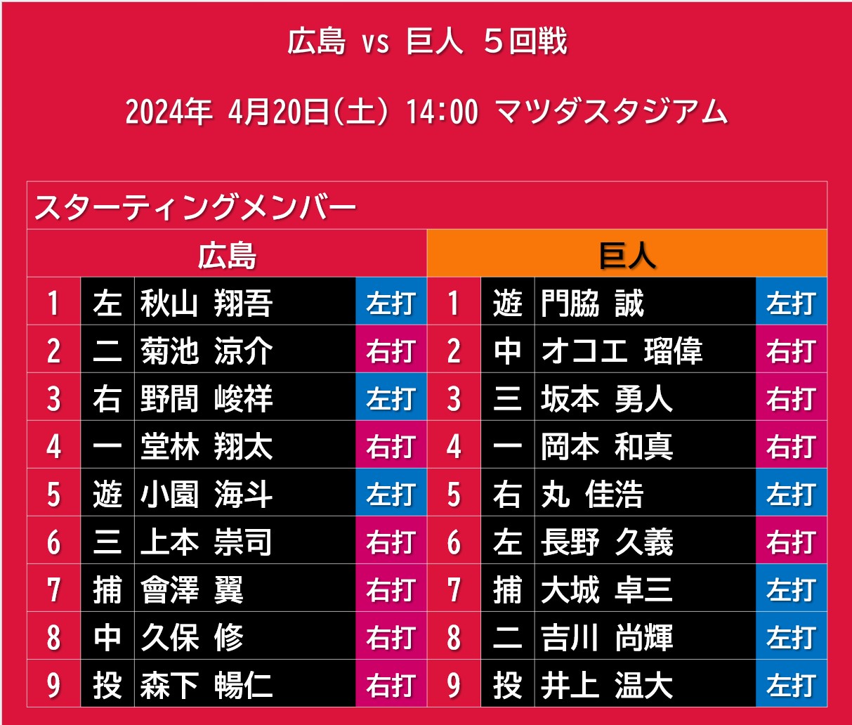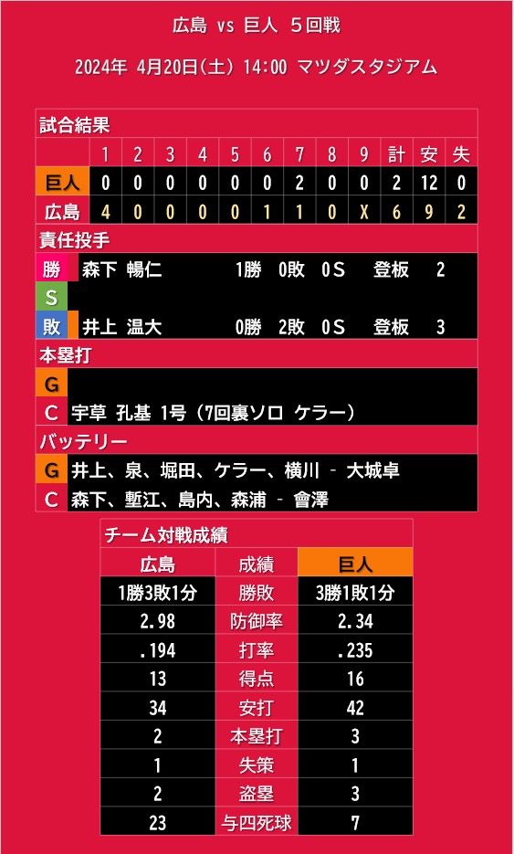 【試合結果】2024年4月20日(土)◆vs 巨人 5回戦 (マツダスタジアム) 2024年04月20日 カテゴリ:広島東洋カープ◆試合結果 mixiチェック こいほーまさとのときはうぐ。 タグ :#試合結果