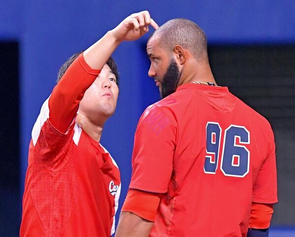 | 広島・メヒアのイメチェン丸刈りに磯村が興味津々!? 9月1日の中日戦(ナゴヤドーム)から1軍に再昇格したメヒア(右)。トレードマークの立派なひげとは対照的に、頭はすっきりとした丸刈りで現れた。そこに近づいて来たのが磯村。メヒアのヘアスタイルが気になっ… (出典:野球(デイリースポーツ)) |