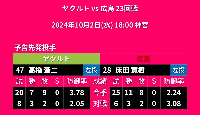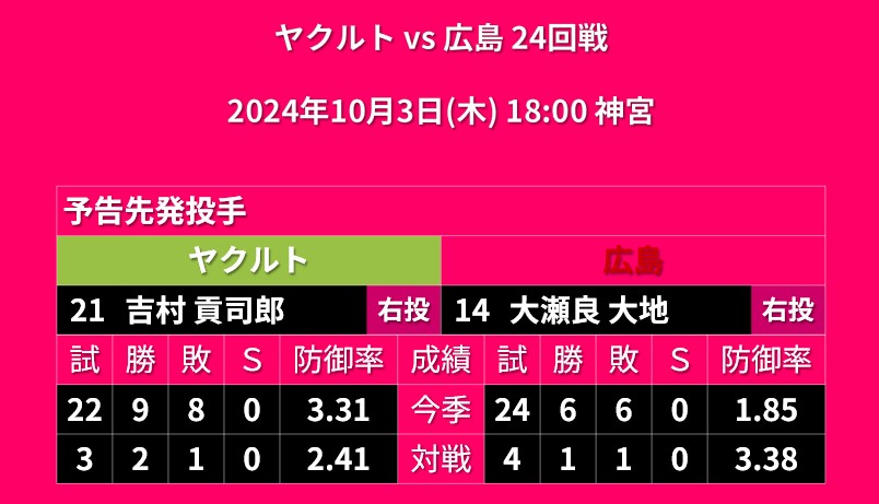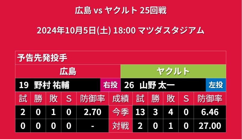 【予告先発】2024年10月5日(土)◆vs ヤクルト 25回戦 (マツダスタジアム)