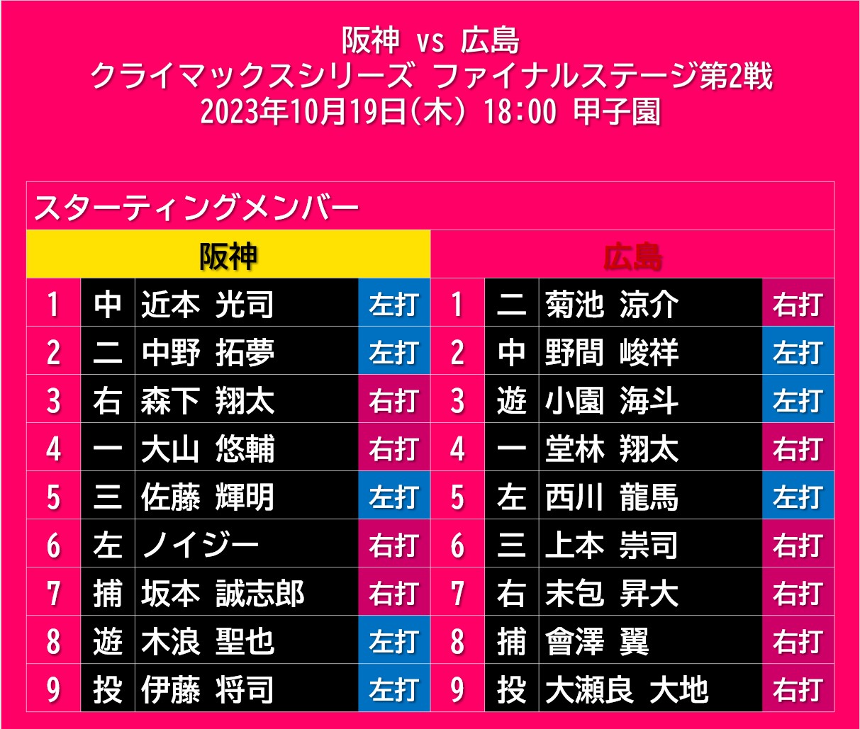 【スタメン】2023年10月19日(木)◆vs 阪神 CSファイナルステージ第2戦 (甲子園) 2023年10月19日 カテゴリ:広島東洋カープ◆スタメン mixiチェック タグ :#スタメン#2023セ・リーグCS